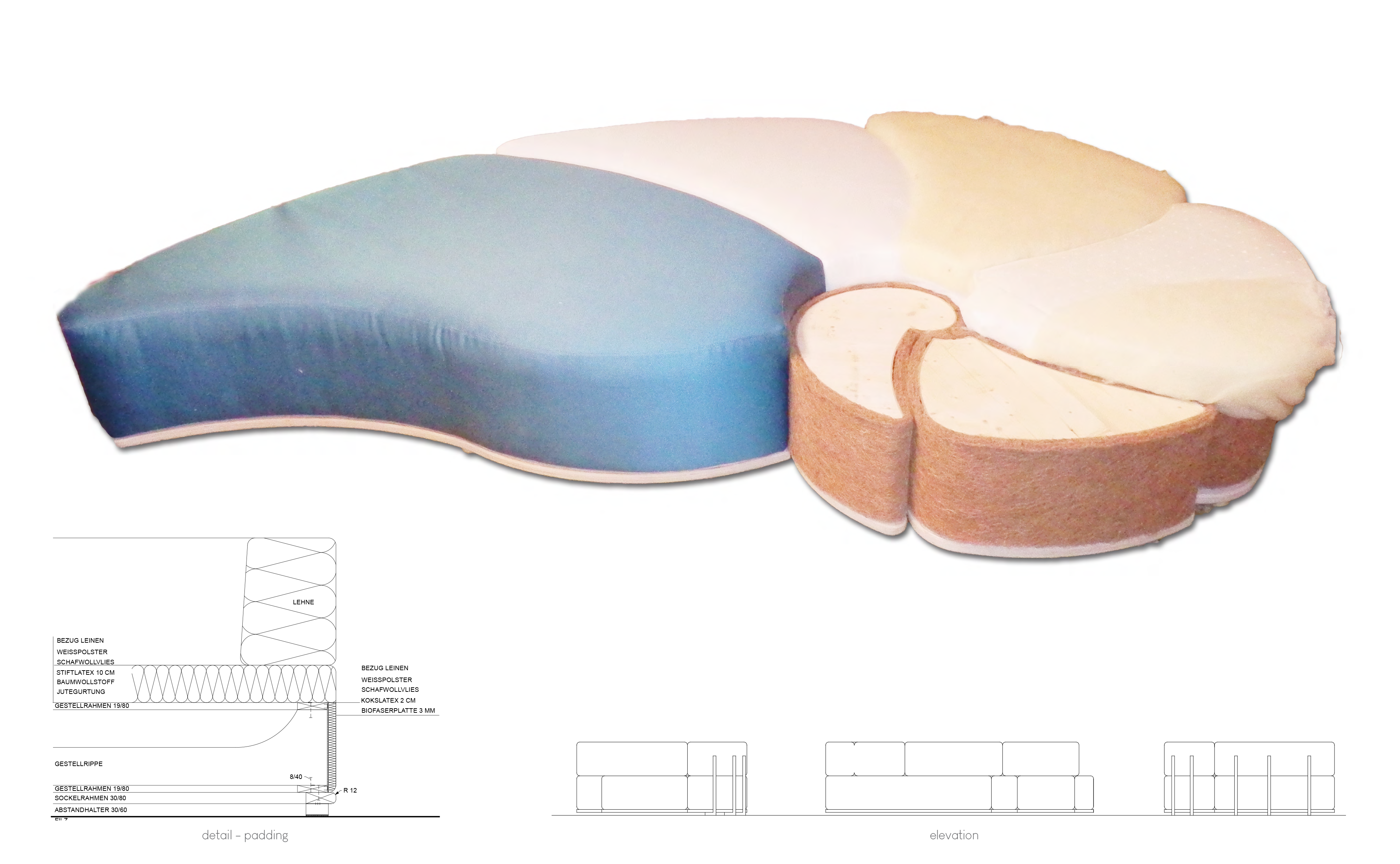 The desire of the building owner to create a space that has room for relaxation and retreat as well as communication was fulfilled through a multifunctional piece of upholstered furniture. The form of the seating area resulted from the nautilus shell whose proportions are arranged in a golden ratio. The seating ensemble consists of six segments. The three bigger elements are integrated units and hold a removable backrest, the three smaller elements are flexible. By arranging the bigger elements next to each other and removing the backrest, a bed surface for two people can be formed. A stone slab converts the smallest element into a coffee table, the two remaining segments function as stools
